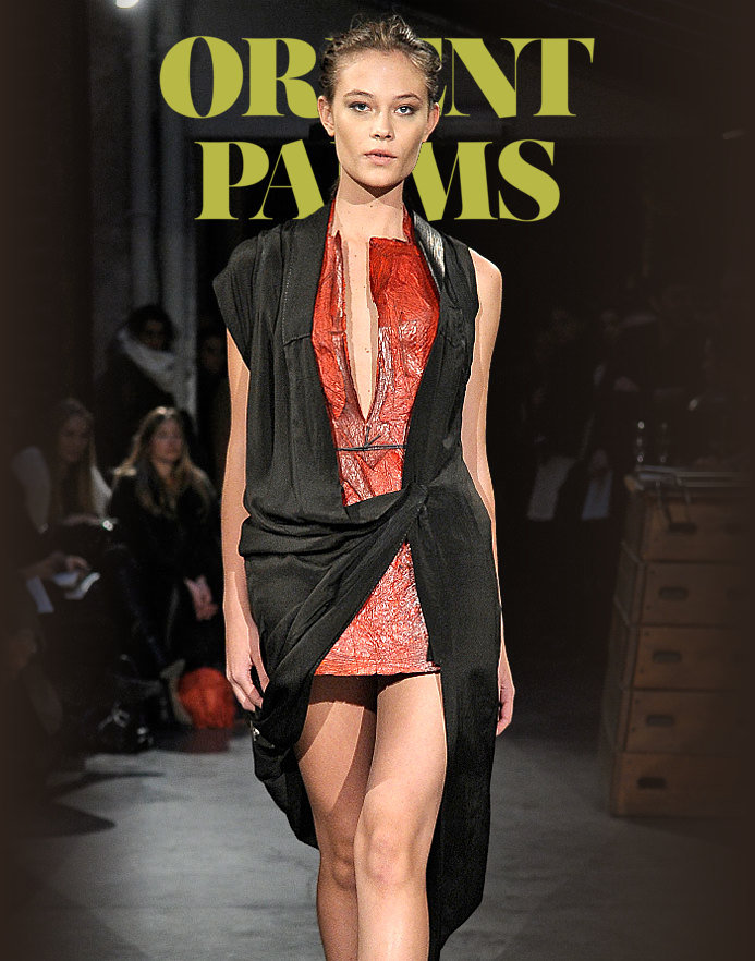 Black silk reworked “kimono” orange and yellow overstitched paper coat soles “Havaianas” set as sandals with leather straps and black Nymphenburg porcelainheels.